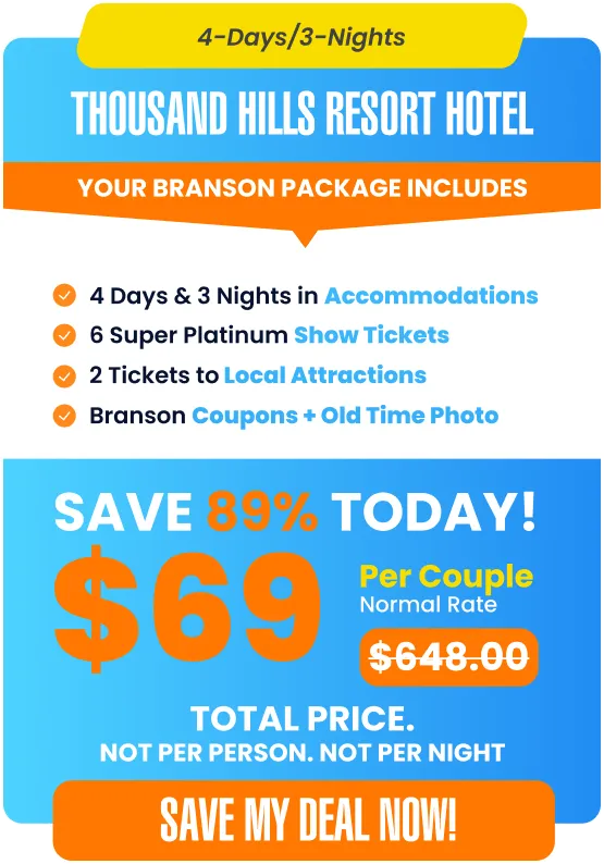 4-Days and 3-Nights at the Thousand Hills Resort Hotel in Branson, MO for only $69. A complimentary breakfast buffet is available every morning.